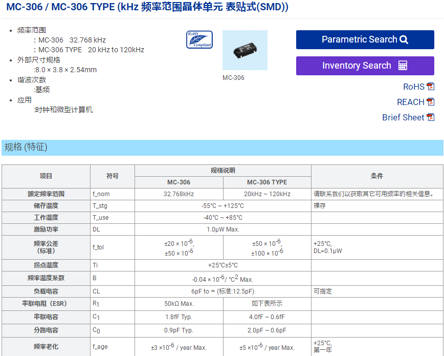 今天來介紹下無源晶振MC-306,晶體諧振器MC-306,屬于愛普生無源晶振,表晶32.768K,MC-306同時也提供20kHz~120kHz范圍內的頻率定制。相較于MC-146,MC-306尺寸略大。在32768hz工作頻率下具有較小的串聯電阻(20kΩ Max.)。MC-306常用的負載電容有MC-306 6pF,9pF,12.5pF等等。MC-306廣泛應用于小型便攜式通信設備,時鐘和微型計算機如手機、GPS模塊、FM調諧模塊、PHS、PDA、數碼相機、、Zigbee、血糖值測量儀、信用卡結算機、各種微機的預備 時鐘、無繩電話、移動設備、電表等儀器設備等。下面南山電子給大家詳細的介紹下愛普生MC-306同系列晶振型號: