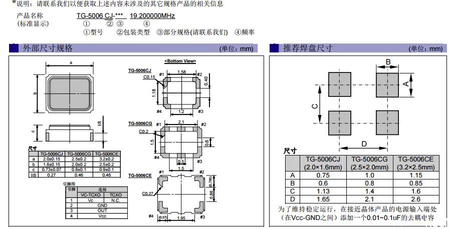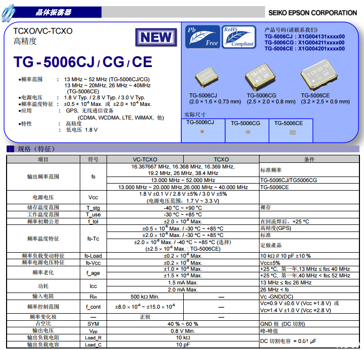 今天給大家介紹TG-5006系列:TG-5006CJ,TG-5006CG,TG-5006CE。精密的時(shí)間是現(xiàn)代通信、導(dǎo)航定位以及計(jì)算機(jī)自動(dòng)控制的關(guān)鍵和核心,目前主流應(yīng)用都是采用TCXO溫補(bǔ)晶振來提供。高精度晶振廠商愛普生晶振新推出超小型溫補(bǔ)晶振TG-5006系列:TG-5006CJ,TG-5006CG,TG-5006CE。其中每個(gè)型號(hào)都對(duì)應(yīng)3種版本:VC-TCXO、TCXO和TCXO(具待機(jī)功能),可滿足多樣化的用戶需求。低功耗、頻率穩(wěn)定、小型化的優(yōu)點(diǎn)讓其適合應(yīng)用于GPS設(shè)計(jì)、射頻和無線通信設(shè)備(CDMA、WCDMA、LTE、WiMAX)等有高精度和高可靠性要求的設(shè)備。TG-5006根據(jù)型號(hào)的不同具有不同的輸出頻率范圍,其中TG-5006CJ,TG-5006CG的輸出頻率范圍為13~52MHz,TG-5006CE的輸出頻率范圍為13~20MHz,26~40MHz,多種頻率輸出為用戶的設(shè)計(jì)提供了更加靈活的選擇,那么TG-5006CJ,TG-5006CG,TG-5006CE三種型號(hào)該如何識(shí)別,三個(gè)型號(hào)規(guī)格參數(shù)又有什么區(qū)別呢?南山電子幫你具體來分析下,首先我們來看規(guī)格書: