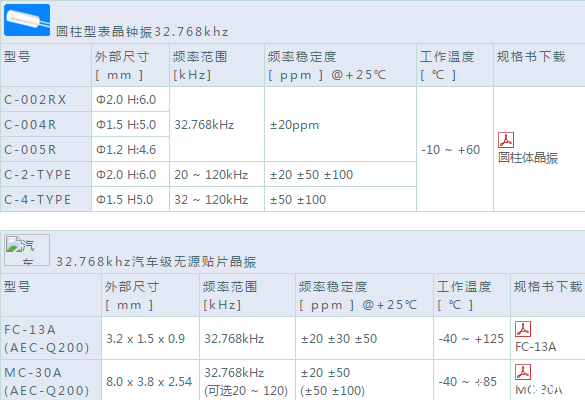 我們在電子市場里,常聽到的晶振頻率就是32.768KHz,其實32.768K貼片晶振在日常生活中確實不可或缺。主要是因為32.768K貼片晶振比較容易分頻以便于產生1秒的時鐘頻率,因為32768等于2的15次方。我們每天用的手機,手表,電腦上顯示作用的鐘就是由它演變過來的。32.768K貼片晶振晶體主要被使用在各種時間顯示的計時電路中,因此也常常被稱為表晶或者鐘振。其中無源的晶體諧振器因其相對低廉的價格,使用較為廣泛,因為其切割方式,也被稱為音叉晶振。愛普生的表晶鐘振在市場具有重要市場地位,愛普生晶振在32.768K貼片晶振,MHZ以及GHZ上都有重大突破,并且以32.768K貼片晶振享譽晶振行業,32.768K的神奇在于它對時鐘的控制性能,精密度越高的表晶對時間控制的越精準,32.768K晶體分為貼片式和直插式,不同的電子產品使用的晶體也不一樣,直插式我們常見的就是2X6和3X8系列的,32.768K貼片晶振就有很多種了,貼片系列的性能要比直插式的好很多,作為愛普生晶振官方授權中國區核心代理商,南山電子為大家精心整理了32.768K貼片晶振全系列規格和型號表,如下圖所示: