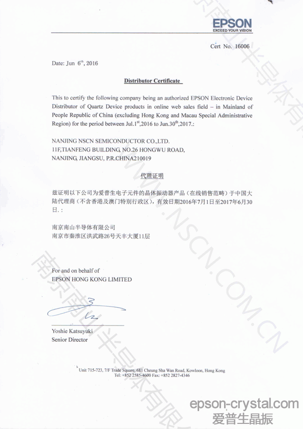 愛普生公司為南京南山半導(dǎo)體有限公司2016年度新頒發(fā)的授權(quán)代理證書編號與2015版略有不同,由15006變更為16006,望周知。